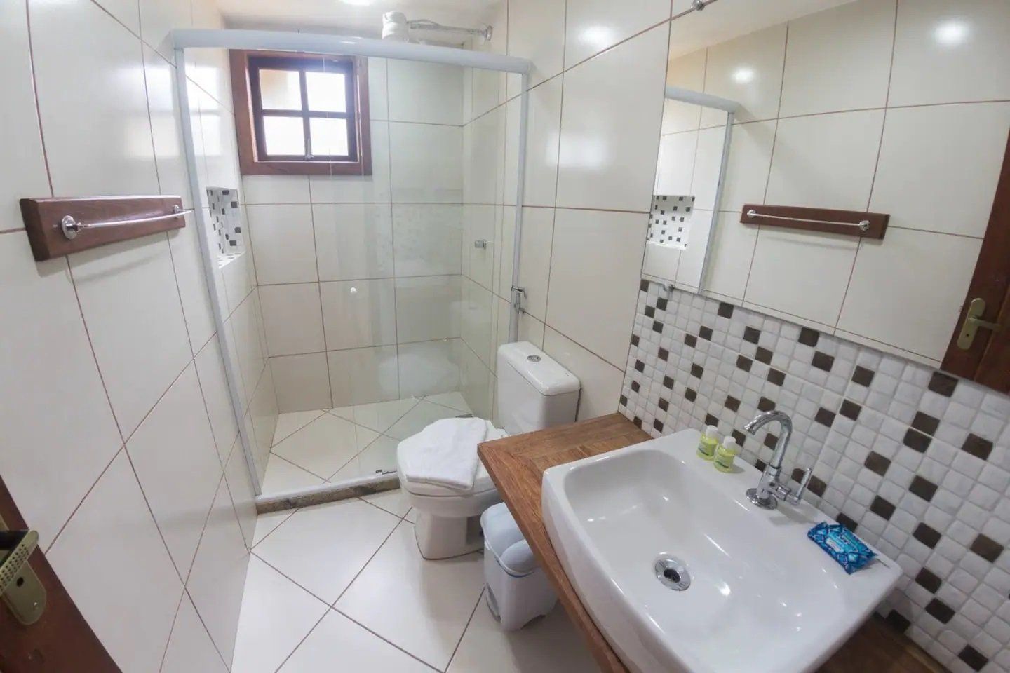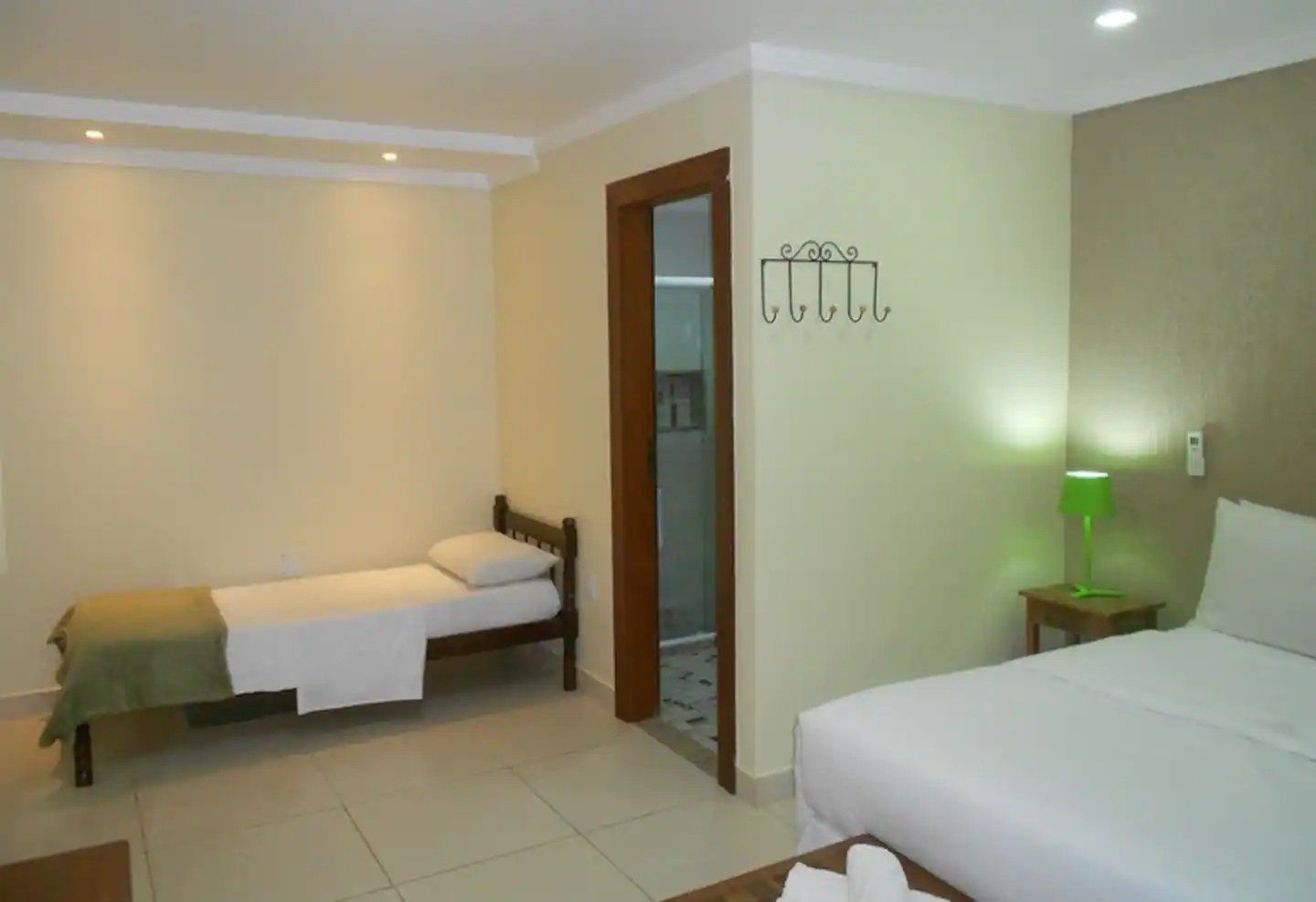 Ampla suíte equipada com: ar condicionado, cama de casal + 1 cama de solteiro, TV a cabo, frigobar, varal para roupas, mesa com cadeiras externas e secador de cabelo. Localizado no andar térreo.