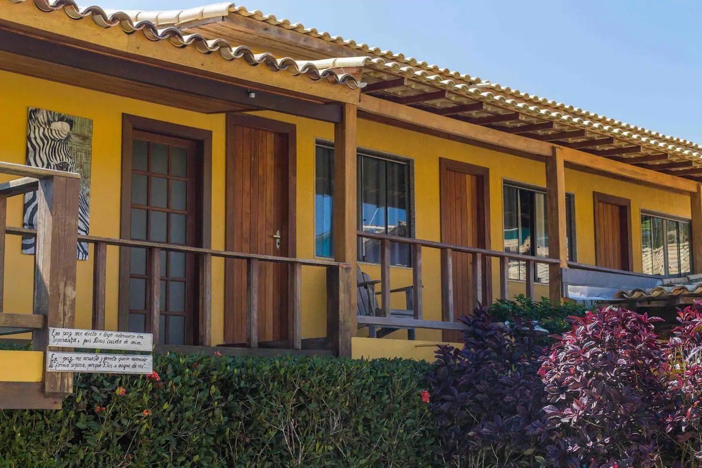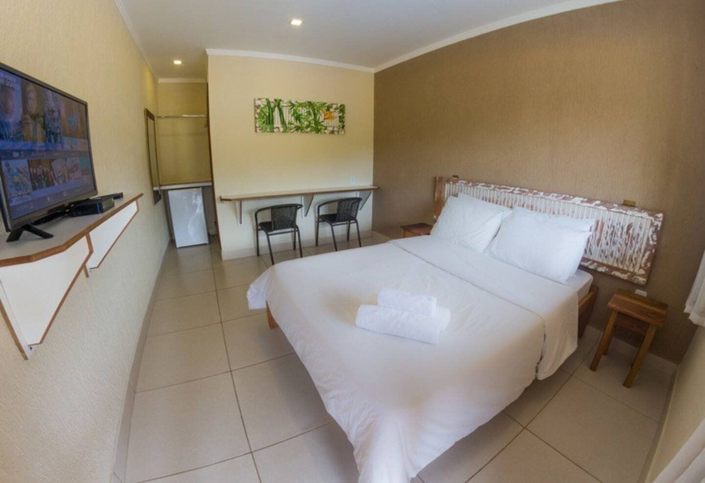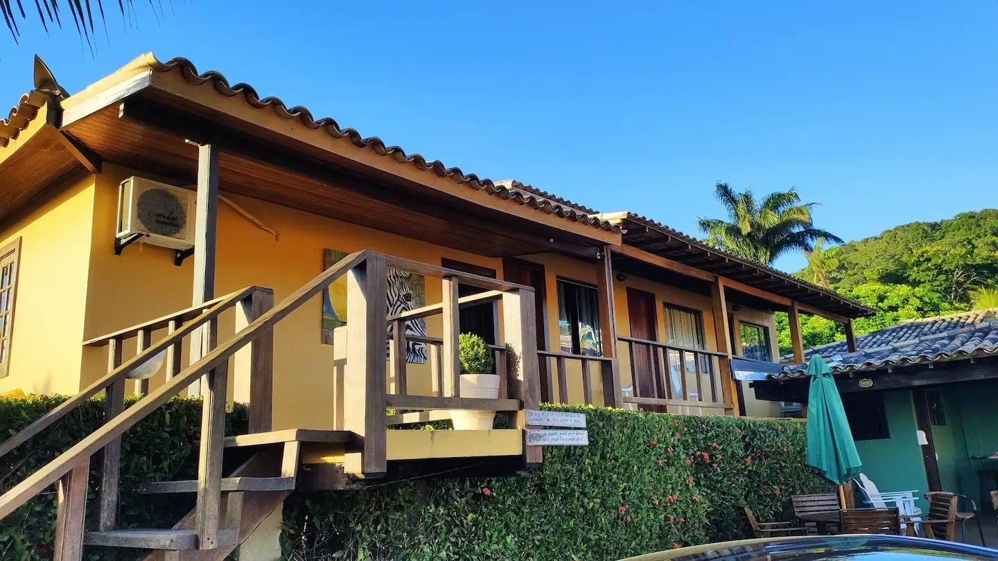 Confortáveis suítes equipadas com: ar condicionado, cama casal, TV a cabo, frigobar, varal para roupas, mesa com cadeiras externas e secador de cabelo. Localizados no andar superior.