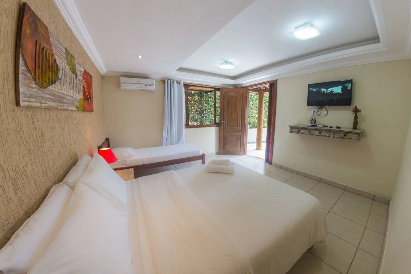 Ampla suíte equipada com: ar condicionado, cama de casal + 1 cama de solteiro, TV a cabo, frigobar, varal para roupas, mesa com cadeiras externas e secador de cabelo. Localizado no andar térreo.